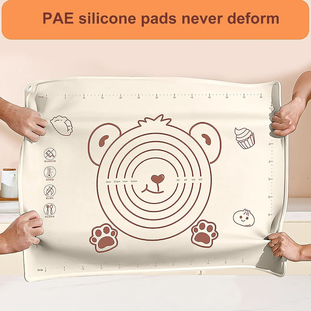 3 In1 Heavy Silicone Baking Mat With Wooden Belan & Cake Scraper, Non Stick Pastry Mat Sheet for Dough Rolling, Dough Mat Pie Crust Rolling Mat Fondant Mat Oven Liner (3 Pcs Set / 70×50 CM)